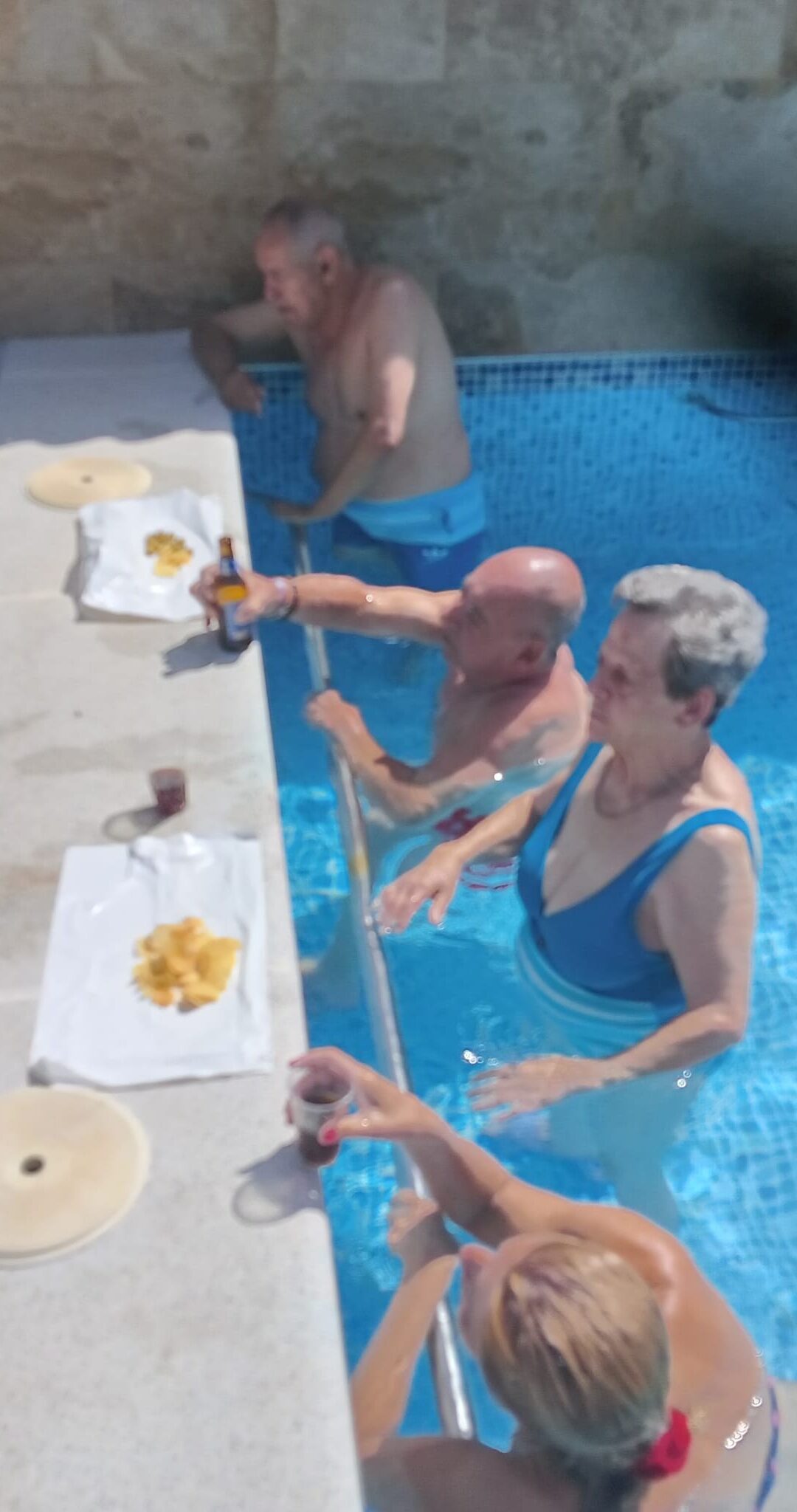 Que mejor forma de combatir el calor que dándonos un baño en nuestra piscina. En ella realizamos diferentes actividades como pueden ser gimnasia acuatíca o distintas actividades físicas grupales. Además, nos tomamos nuestro tentempié de media mañana o merienda fresquitos. Unas veces se trata de un refresco con patatas y en otras ocasiones un rico helado.